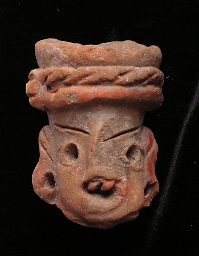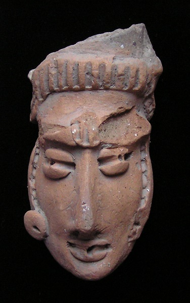 Nopilioa, 100-600 AD, Veracruz Statue face fragment Classic Veracruz culture (or Gulf Coast Classic culture) refers to a cultural area in the north and central areas of the present-day Mexican state of Veracruz, a culture that existed from roughly 100 to 1000 CE, or during the Classic era.[1] El Tajin was the major center of Classic Veracruz culture; other notable settlements include Higueras, Zapotal, Cerro de las Mesas, Nopiloa, and Remojadas, the latter two important ceramics centers. The culture spanned the Gulf Coast between the Pánuco River on the north and the Papaloapan River on the south. Size: 1-7/8-inch tall Condition: Excellent condition, with good mineral deposits, Stable NOTE: A group MesoAmerican antiquities recently aquired were mounted in a shadow box. Substantial residual glue (resin or silicome adhesive) used in the mounting is on the back of this piece. BUY NOW $89.95 plus shipping |