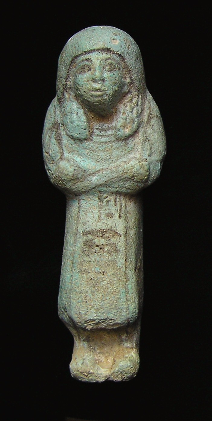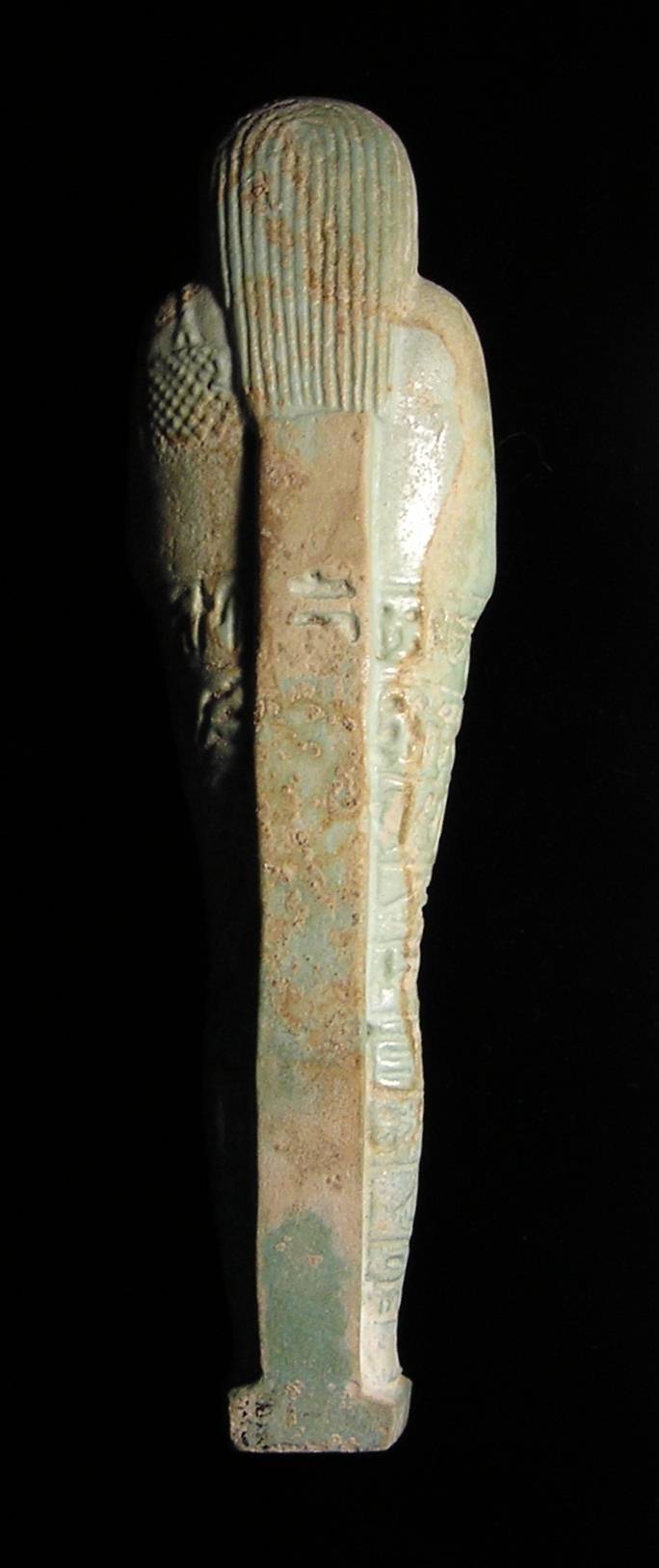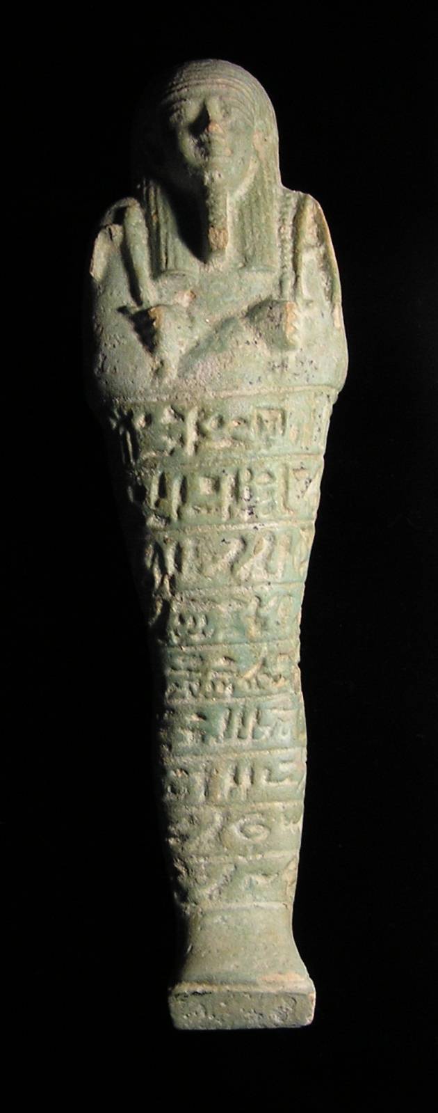 EGYPTIAN TOMB Ushabti - 664 to 525 BC, XXVI Dynasty Hieroglyphs around top and down front HIGH QUALITY !! Historical Context: See above. Hieroglyphs Translation: "He who is enlightened, Ka, if one counts, you shall say 'here I am'" Attribution/Description: Date: