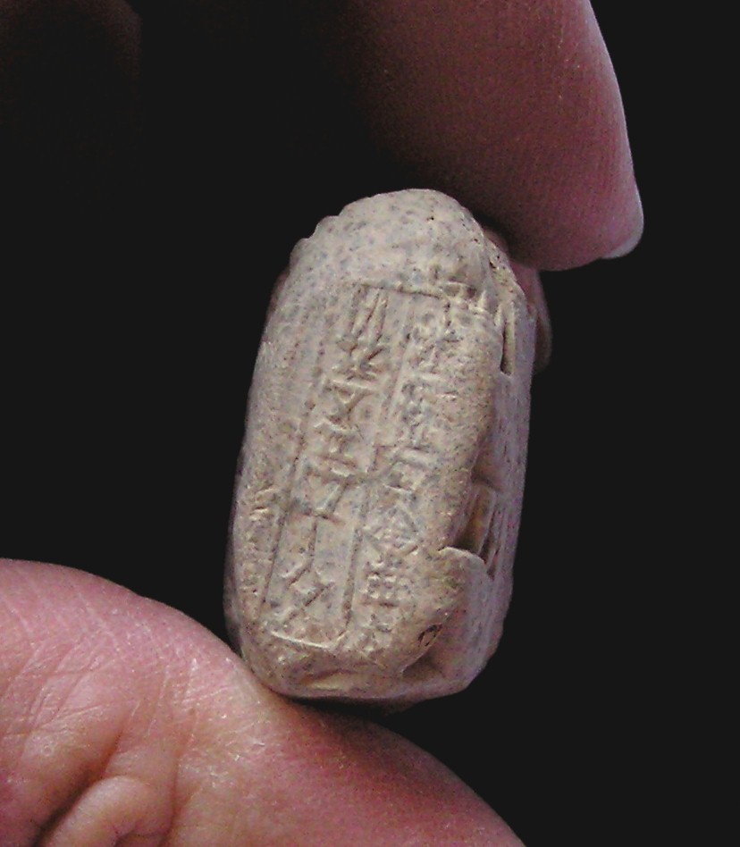 #8787: Cuneiform Tablet - Tag for sheep carcasses Historical Context: See above The tablet is a tag. See the break point at bottom edge. It features two unusual markings, one is a seated male figure (see main photo) and the other is a cylinder seal rolled edge (see second photo). This is a tag for a group of sheep carcasses. Attribution: Cuneiform Tablet, 2000 to 1300 BC