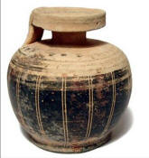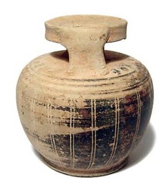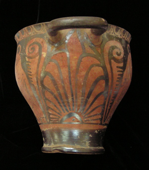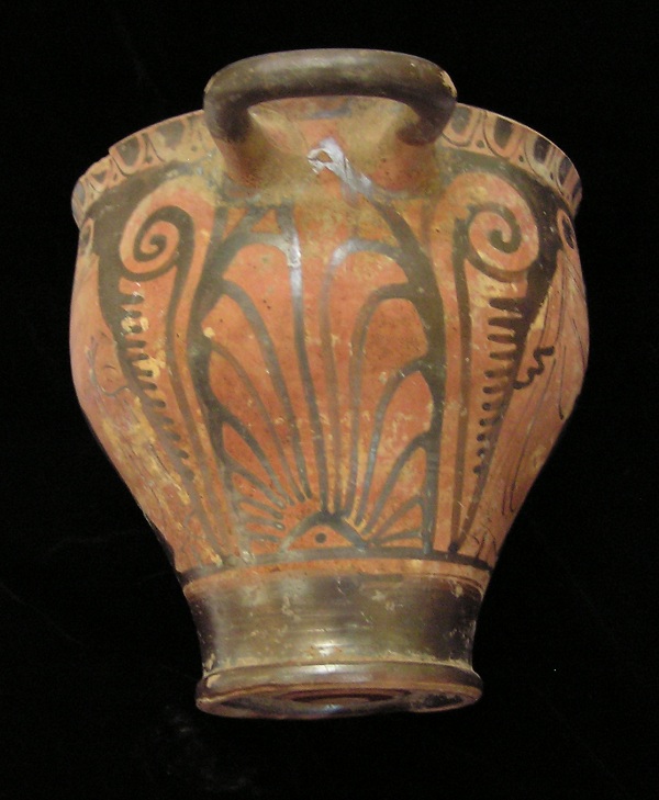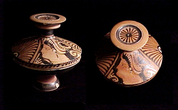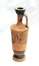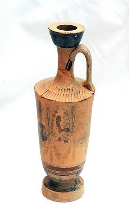 Lekythos - Decorated with Palms Historical Context: This Lekythos (tall vase) is typical of pottery produced in Attica (reghion of Greece near Athens) and the Mediterranean area about the 5th Century BC. This is the era just before Philip II (Father of Alexander the Great) and Alexander the Great. Attica is a historical region of Greece, containing Athens, Marathon, and Sparta. The historical region is centered on the Attic peninsula, which projects into the Aegean Sea. The history of Attica is tightly linked with that of Athens, which from the Classical period onwards, was one of the most important cities in the ancient world. Classical Athens was a powerful city-state. A centre for the arts, learning and philosophy, home of Plato's Academy and Aristotle's Lyceum, it is widely referred to as the cradle of Western civilization and the birthplace of democracy, largely due to the impact of its cultural and political achievements during the 5th and 4th centuries BC on the rest of the then known European continent. ex-London Trade 2007