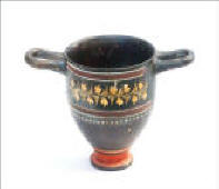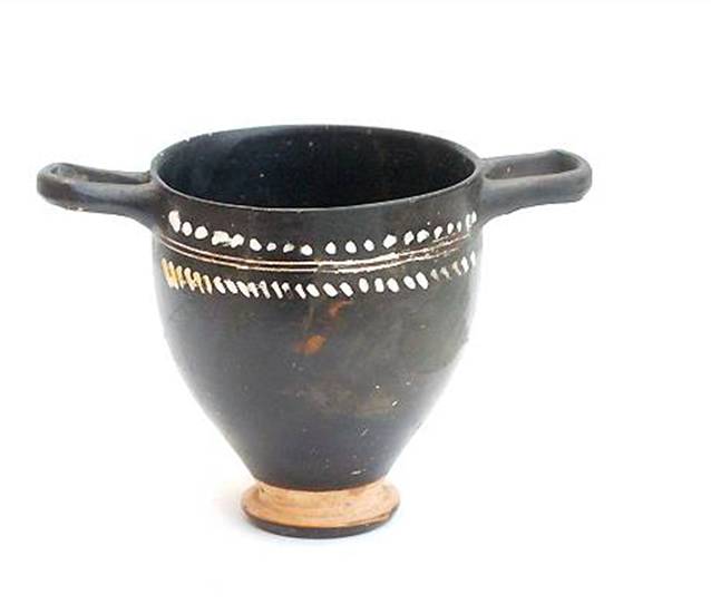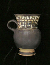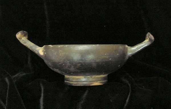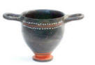Skyphos - Decorated with Vines and Geometric Patterns Historical Context: This Gnatha Skyphos (large cup) is typical of pottery produced in Apulia (southeastern Italy) and the Mediterranean area about 275 to 225 BC. This is the era just after Alexander the Great and the begining of the rise of the Roman Republic. Apulia is a region in southeastern Italy bordering the Adriatic Sea in the east, the Ionian Sea to the southeast. Its southern portion known as Salento, a peninsula, forms a high heel on the "boot" of Italy. The region extends as far north as Monte Gargano, and was the scene of the last stages in the Second Punic War. One of the richest in Italy for archeological findings, the region was settled from the 1st millennium BC by several Illyric and Italic peoples. In the fifth and fourth centuries BC, the Greek settlement at Taras produced a distinctive style of pottery (Apulian vase painting). Apulia was an important area for the ancient Romans, who conquered it during the course of wars against the Samnites and against Pyrrhus in the fourth and third centuries BC but also suffered a crushing defeat here in the battle of Cannae against Hannibal. However, after the Carthaginians left the region, the Romans captured the ports of Brindisi and Taranto, and established dominion over the region. During the Imperial age Apulia was a flourishing area for production of grain and oil, becoming the most important exporter to the Eastern provinces. ex-London Trade 2007