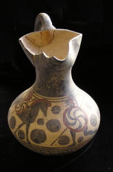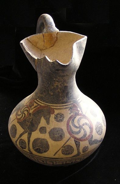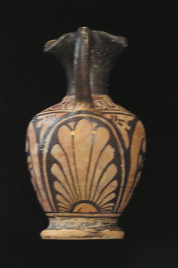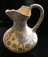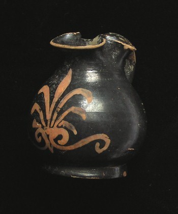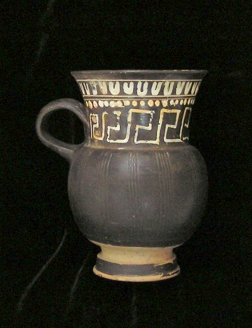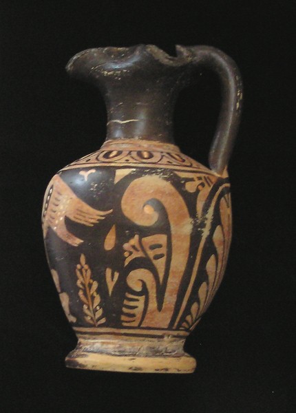 Oinochoe - Decorated with Palm No Repairs - Beautiful !! Historical Context: This Oinochoe (vase) is typical of pottery produced in Magna Graecia and the Mediterranean area about 350 to 300 BC. This is the era of Philip II (Father of Alexander the Great) and Alexander the Great which lead to a unique period of unification of the Mediterranean and Persian worlds. The pattern is typical of the late geometric era.
