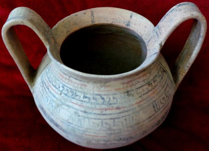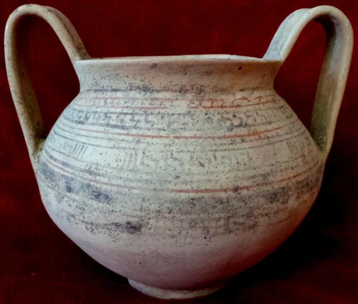 4th to 3rd Century BC (Peucetian Civilization) Decorated with Geometric Designs!! Nice LARGER Piece !! Historical Context: This aryballos is typical of pottery produced in in Apulia (Italian Pennisula) during the 4th to 3rd century BC. This is the geometric era, before the archaic era, about the time of Homer and the founding of Carthage by the Phonecians (814 BC) and the founding of Rome by the Romans (753 BC). An aryballos is a narrow-necked, spherical or globular Greek vase. Commonly used as a scent or oil bottle, particularly by athletes at the baths, the aryballos derives from the globular (oinochoe) of the Geometric style.