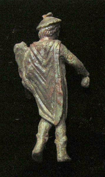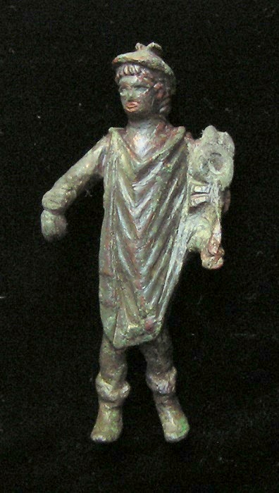 #11468: Greek Region - 4th to 1st Century BC, Small Bronze Statue - Hermes Historical Context: This statue is typical of small ornamental statues produced in Magna Graecia and the Mediterranean area about 4th to 1st centuries BC. This is the period where the Italian peninsula is transitioning from Greek colonies to total Roman control. Hermes: God of boundaries, travel, communication, trade, thievery, trickery, language, writing, diplomacy, athletics, and animal husbandry. The son of Zeus and Maia, Hermes is the messenger of the gods, and apsychopomp who leads the souls of the dead into the afterlife. He was depicted either as a handsome and athletic beardless youth, or as an older bearded man. His attributes include the herald's wand or caduceus, winged sandals, and a traveler's cap. His sacred animals are the tortoise, the ram, and the hawk. The Roman Mercury was more closely identified with trade and commerce. Features: Hermes holding his caduceus and wearing a cloak (chlamys) and hat (petasus) for travel Height: 75mm (2 3/4 inches) Condition: In tact, Relatively even colored patina