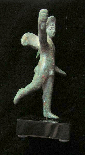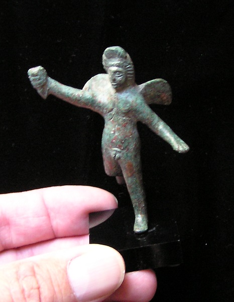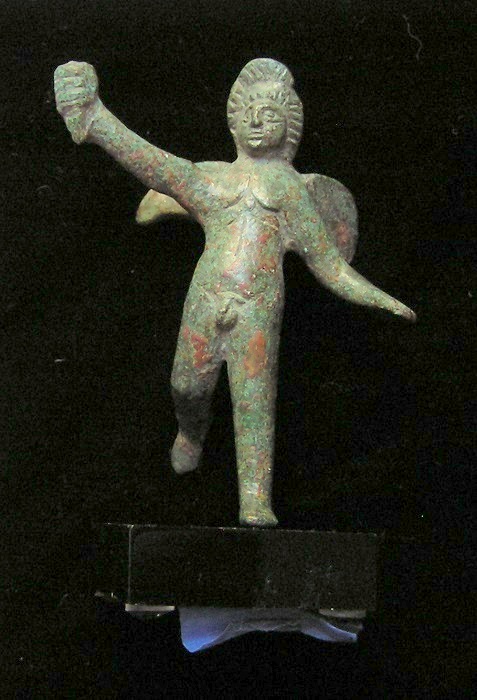 #11469: Greek Region - 4th to 1st Century BC, Small Bronze Statue - Eros Eros, god of love and sexual intercourse Mounted on Base !!Historical Context: This statue is typical of small ornamental statues produced in Magna Graecia and the Mediterranean area about 4th to 1st centuries BC. This is the period where the Italian peninsula is transitioning from Greek colonies to total Roman control. EROS: He was the Greek god of love. His Roman counterpart was Cupid ("desire"). Some myths make him a primordial god, while in other myths, he is the son of Aphrodite. In later Greek mythology, Eros is represented as the son of Aphrodite, whose mischievous interventions in the affairs of gods and mortals cause bonds of love to form, often illicitly. Ultimately, in the later satirical poets, he is represented as a blindfolded child, the precursor to the chubby Renaissance Cupid – whereas in early Greek poetry and art, Eros was depicted as an adult male who embodies sexual power. A cult of Eros existed in pre-classical Greece, but it was much less important than that of Aphrodite. However, in late antiquity, Eros was worshiped by a fertility cult. In Athens, he shared a very popular cult with Aphrodite, and the fourth day of every month was sacred to him.