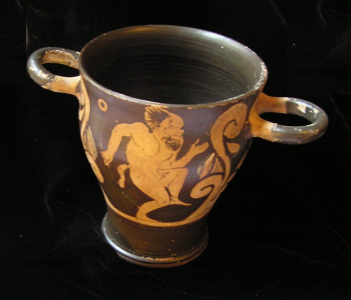 Skyphos - Decorated with Satyr and "Lady of Fashion" - like APHRODITE !! Outstanding Piece !! Historical Context: This Gnatha Skyphos (large cup) is typical of pottery produced in Magna Graecia and the Mediterranean area about 350 to 300 BC. This is the era of Philip II (Father of Alexander the Great) and Alexander the Great which lead to a unique period of unification of the Mediterranean and Persian worlds. The Satyr is portrayed as being strongly built with pug nose, large pointed ears, long curly hair, and full beards. They are described as roguish but faint-hearted folk, subversive and dangerous, yet shy. They are lovers of wine, women and boys, and are ready for every physical pleasure. The female is a "Lady of Fashion" often found during this era and is similar to Aphrodite, Greek Goddess of love.