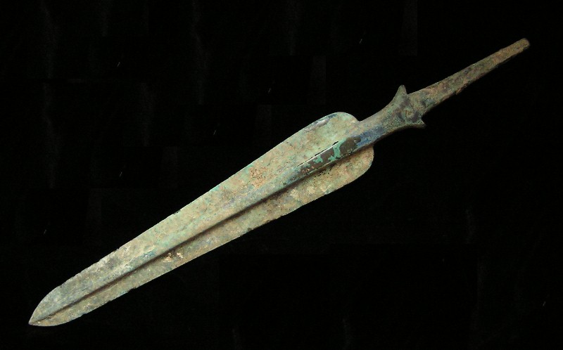 #9056: Mesopotamia/Luristan Spear Tip - 1,200 to 900 BC This spear tip is BRONZE and measures about 220 mm (9 inches) long. Choice plus condition, Edge still sharp !!!