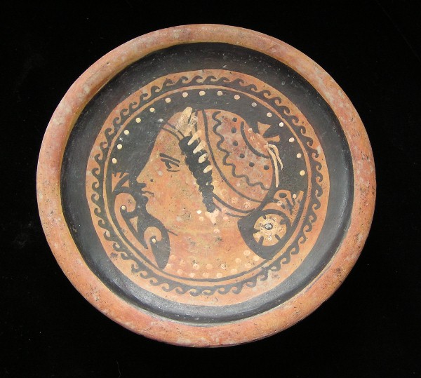 #9564: Magna Graecia - 4th to 3rd Century BC, Plate - Decorated with "Lady of Fashion" - like APHRODITE !! Lovely !! Historical Context: This plate is typical of pottery produced in Magna Graecia and the Mediterranean area about 350 to 320 BC. This is the era of Philip II (Father of Alexander the Great) and Alexander the Great which lead to a unique period of unification of the Mediterranean and Persian worlds. The female is a "Lady of Fashion" often found during this era and is similar to APHRODITE, Greek Goddess of LOVE. This plate is about 5-inches diameter. Please see the picture. It is intact with minor chipping. Truly, it's a lovely piece.