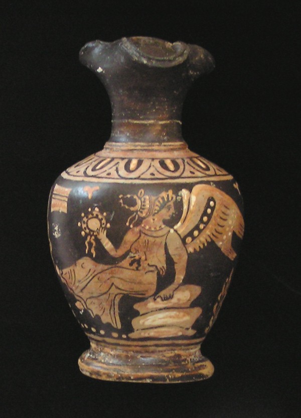 Oinochoe Bucchero - Decorated with Nike and Palm!! Sharp Piece !! Historical Context: This Oinochoe Bucchero (Vase) is typical of pottery produced in Magna Graecia and the Mediterranean area about 350 to 300 BC. This is the era of Philip II (Father of Alexander the Great) and Alexander the Great which lead to a unique period of unification of the Mediterranean and Persian worlds. The Nike is seated on rocks holding a wreath. Nike's hair is pulled to back and decorated. She is wearing a full length dress.. Nike represents victory, typically over an enemy state.