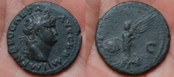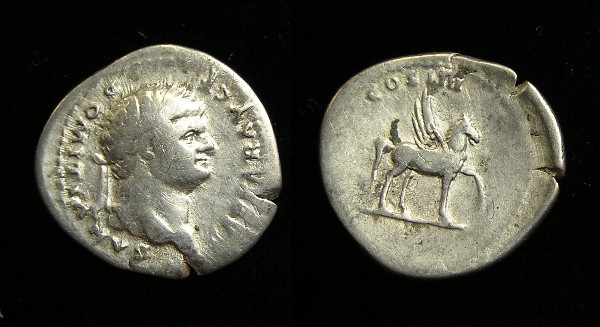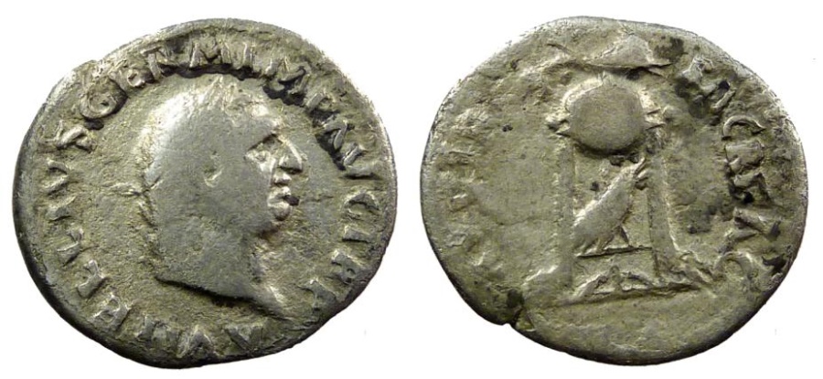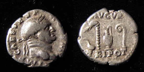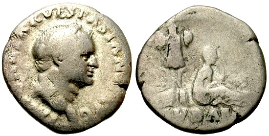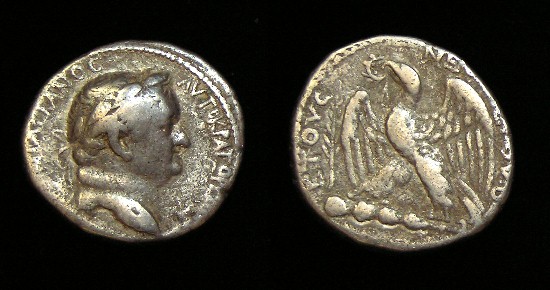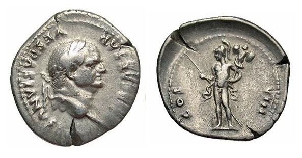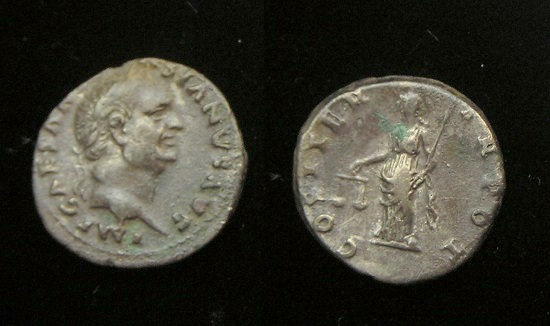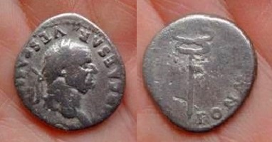 #10879: SILVER Denarius, This coin featured in picture in atricle (center coin - upside down) Historical Context: See above Obv: Vespasian SOLD $199 plus shipping