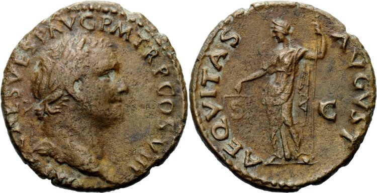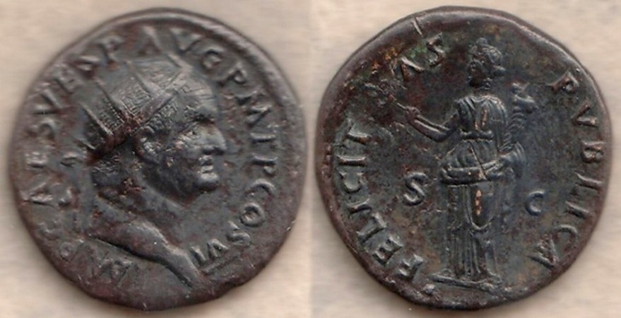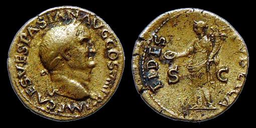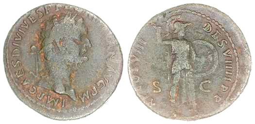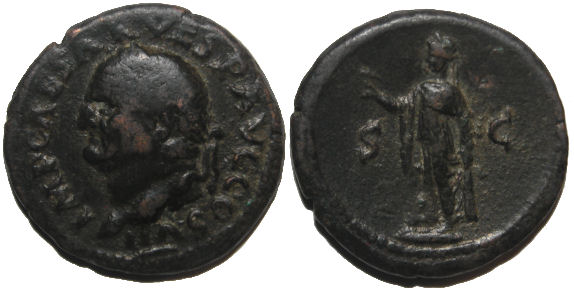 VESPASIAN Made a Name for Himself Putting Down the Judaean Revolt 69 to 79 AD Historical Context: These coins were minted by the Roman Empire during the reign of Vespasian (69 to 79 AD). T. Flavius Vespasianus, the son of Flavius Sabinus, a tax-gatherer, and Vespasia Polla. Despite his humble origin, his military skill carried him to a series of important posts, including the invasion of Britain and the revolt in Judea. In 69, he was proclaimed emperor. He quickly set about repairing the damage caused by the civil wars. He is the Emperor that built the Colesium. He proved to be a just and industrious ruler. He was deified by the Senate when he died.