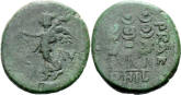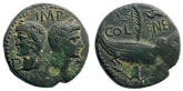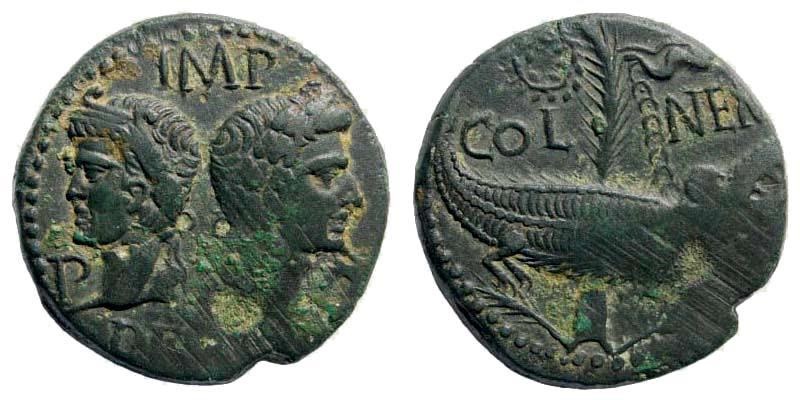 Augustus, 29 BC to 14 AD (Commemorates Battle of Actium - where the forces of Augustus Defeated Marc Antony and Cleopatra) Historical Context: See above This issue (with the P P) is the scarcest of the standard weight Nemausus dupondii. Interestingly, the captive crocodile is still used on the coat of arms of Nimes (formerly Nemausus). Obv: Agrippa (left) and Augustus (right) SOLD $249 plus shipping