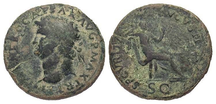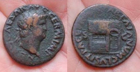 CLAUDIUS: An Unlikely Emperor 41 AD to 54 AD Historical Context: This coin was minted by the ROMAN EMPIRE during the reign of CLAUDIUS (41 - 54 AD). Born Tiberius Claudius Drusus, a childhood attack of infantile paralysis had left him with a grotesque appearance. He was proclaimed (or actually adopted) emperor by the Praetorian Guard. In spite of all that, he proved himself a very capable administrator. He married his niece, Agrippina Junior, and adopted her son, Nero, who became the heir to the throne. He died in 54, most likely by poisoning by his wife, so that her son would be assured to succeed him.