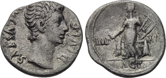 Augustus, 29 BC to 14 AD (Commemorates Battle of Philipi, where the forces of Augustus and Marc Antony defeated the forces of Brutus) Historical Context: See above Obv: Victory placing Wreath SOLD $59.95 plus shipping