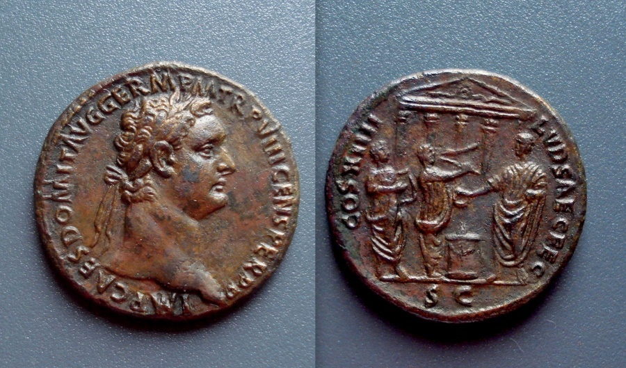DOMITIAN, 81 to 96 AD Historical Context: This coin minted to commerate the Saeculum. In 88 AD, Domitian initiated the Saecular Games (LVDI SAECVLVM), a celebration to mark the commencement of a new age, or Saeculum. The games were first celebrated in either 348 or 249 BC and were supposed to be held every 100 to 105 years; however, after 146 BC the schedule was thrown off track by civil wars and disruptions, and the next Saeculum was not celebrated until Augustus did so in 17 BC. Obv: