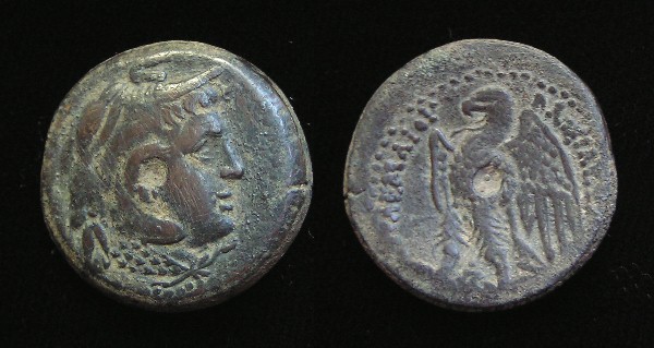 Egyptian Bronze Coins of Alexander Ptolemy, a successor General of Alexander, and Ptolemy's heirs, also minted bronze coins with Alexander's image. The Ptolemaic empire was founded by Ptolemy I after the death of Alexander the Great. Ptolemy I was a boyhood friend of Alexander and his most trusted general. After Ptolemy successfully completed the Persian war, Alexander granted him the area of Egypt. He founded an empire that lasted almost 300 years. The empire ended with Cleopatra VII, the Queen of the Nile. These coins were minted starting shortly after Alexander's death and before Ptolemy assumed the reign as King (Pharaoh) of Egypt, but, continued about 100 years. Most of these bronze coins are about 16 to 27 mm diameter (about the diameter of a US Penny, up to larger than a US Quarter and typically twice as thick). Like his tetradrachms, most of Alexander's bronze coins feature Alexander's portrait wearing a Elephant skin cap. The reverse scene is typically the Ptolemaic Eagle and a legend indicating the Ptoelmaic Dynasty in Greek.