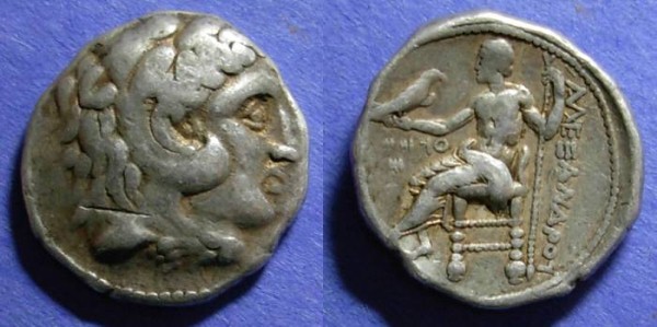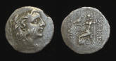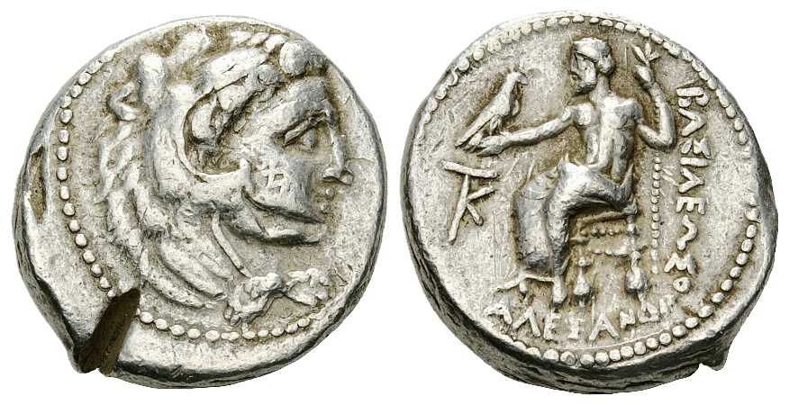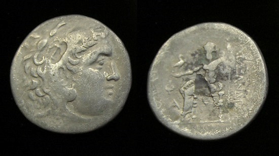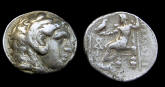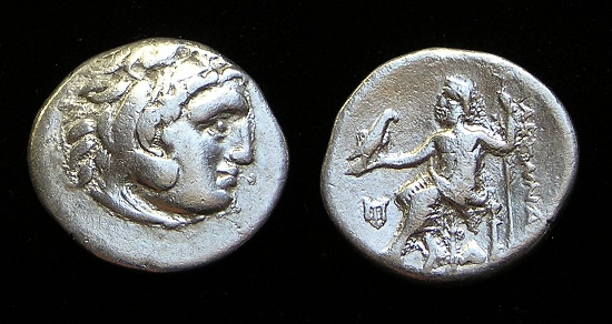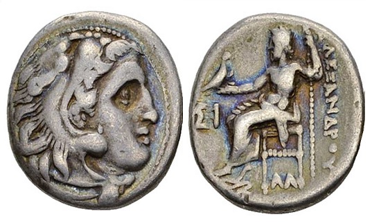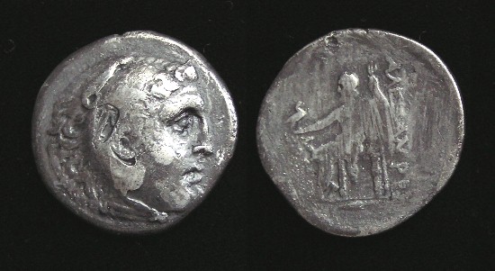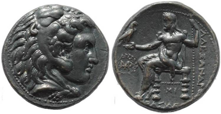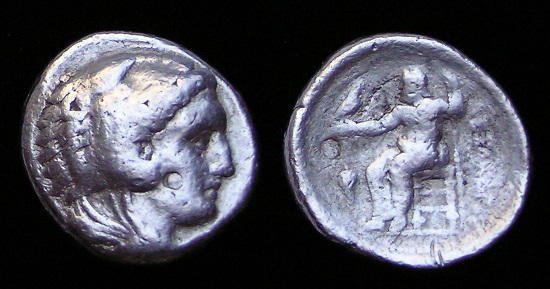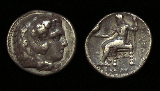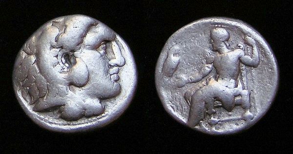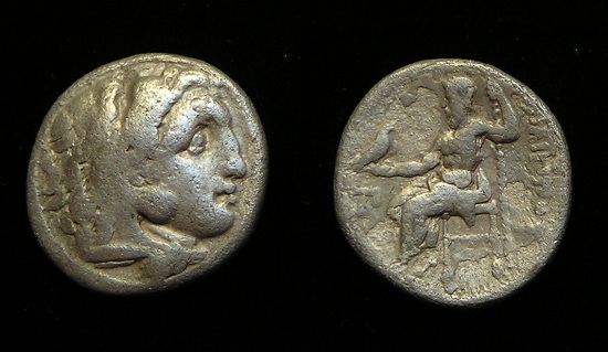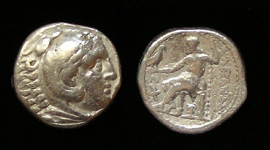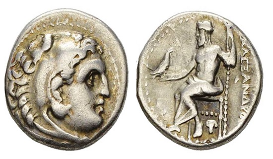 Drachm Coins of Alexander Drachms are medium sized silver coins (1/4 the weight of tetradrachms). Most weight about 4 grams and measure about 16 to 19 mm diameter (about the diameter of a US Dime and twice as thick). These are thematically identical to Alexander's tetradrachms (above) and feature Alexander's portrait as Herakles (same as Roman Hercules). He is wearing a Lion Skin. The Lion Skin is from the Nemeaen Lion killed by Herakles with his bare hands. The reverse scene is Zeus, seated, holding an eagle in his outstretched hand and a legend bearing his name in Greek. When Alexander conquered territories, he looted the conquered kingdoms precious metals, gold and silver (i.e., plunder). He, and his successors, minted coins in his name with that plunder. These coins are the plunder of Alexander the Great.