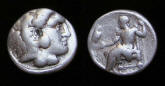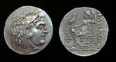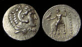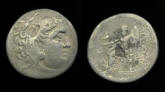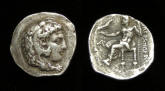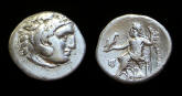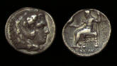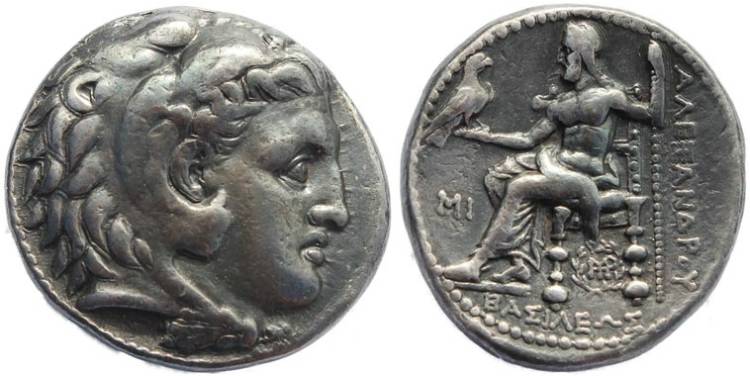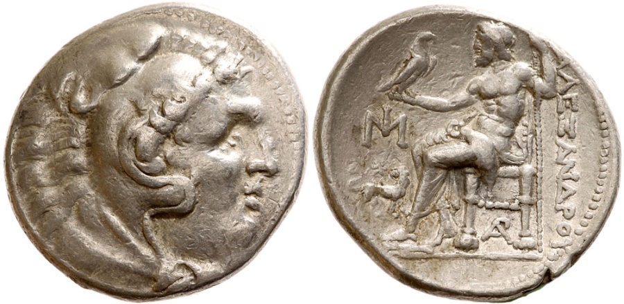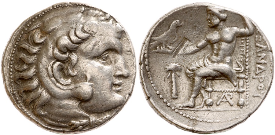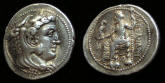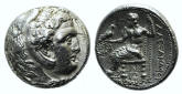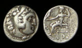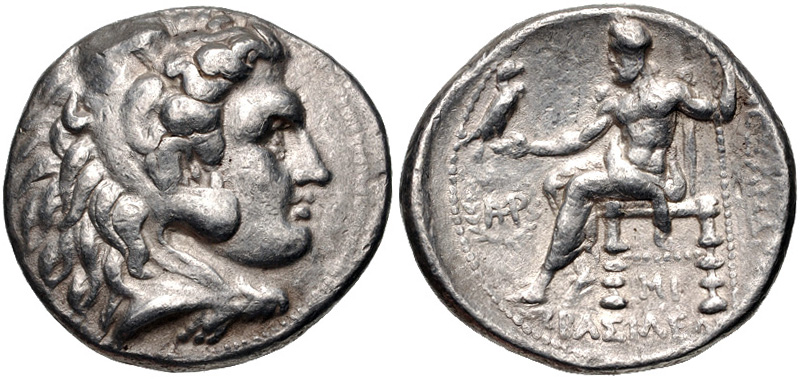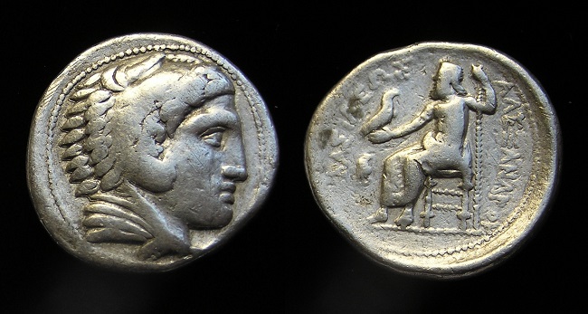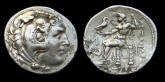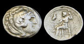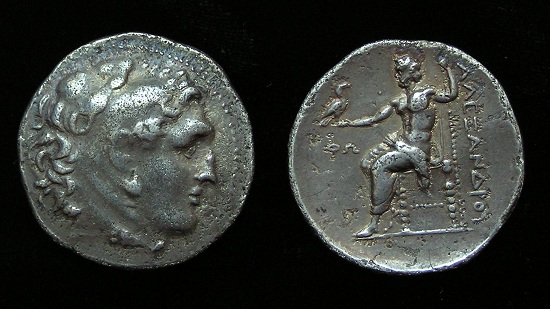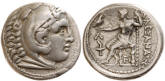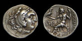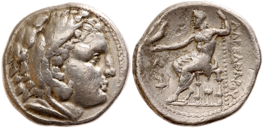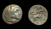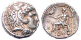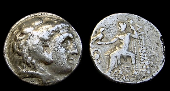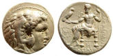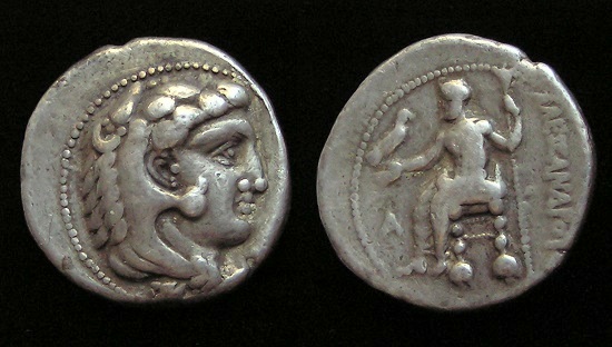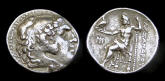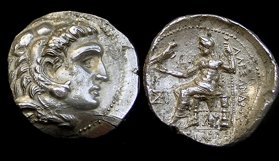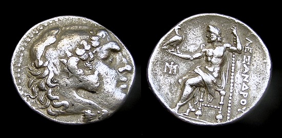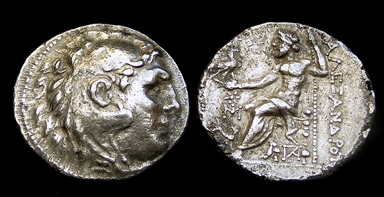 Herakles-type Tetradrachm Coins of Alexander Tetradrachms are large silver coins. Most weight about 17 grams and measure about 24 to 30 mm diameter. The smaller diameter type (24 to 26 mm) are about the diameter of a US Quarter but 2 to 3 times as thick. The larger diameter type (27 to 30 mm) are about the diameter of a US $.50 but twice as thick. Alexander's tetradrachms and drachms features Alexander's portrait as Herakles (same as Roman Hercules). He is wearing a Lion Skin. The Lion Skin is from the Nemeaen Lion killed by Herakles with his bare hands. The reverse scene is Zeus, seated, holding an eagle in his outstretched hand and a legend bearing his name in Greek. When Alexander conquered territories, he looted the conquered kingdom's precious metals, gold and silver (i.e., plunder). He, and his successors, minted coins in his name with that plunder. These coins are the plunder of Alexander the Great.