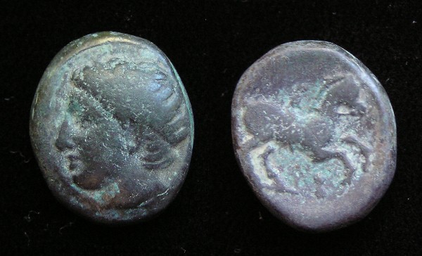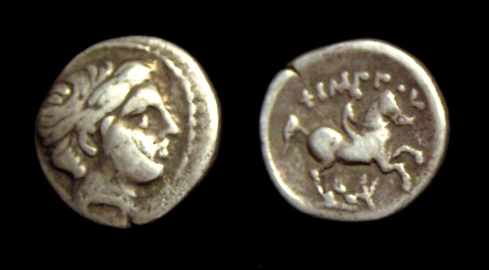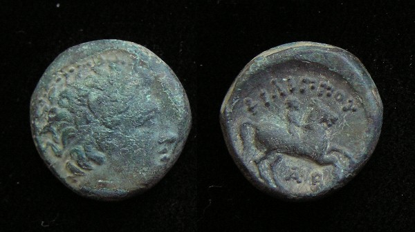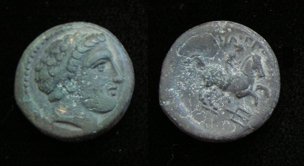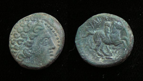 #11067: Bronze – 350 BC, Commemorates an OLYMPIC GAMES VICTORY !! Pretty !! Historical Context: This coin was minted by the MACEDONIAN EMPIRE (494 - 168 BC) during the reign of Philip II. When Philip II was young he won two Olympic equestrian victories. His coins often commemorate those victories. This reverse of this coin shows Philip II's jockey on horseback. Some believe the reverse is intended to be Alexander the Great (as a boy) on Horseback, referring to a challenge that Philip issued to Alexander regarding riding a certain horse. Obv: Apollo (Very Artistic representation) SOLD $69.95 plus shipping